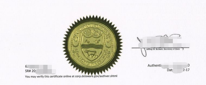 提醒:如果是特拉华州的贴纸印章,则可以直接递交美国国务院认证,然后在递交华盛顿领事馆。不需要在递交特拉华做州政府认证。