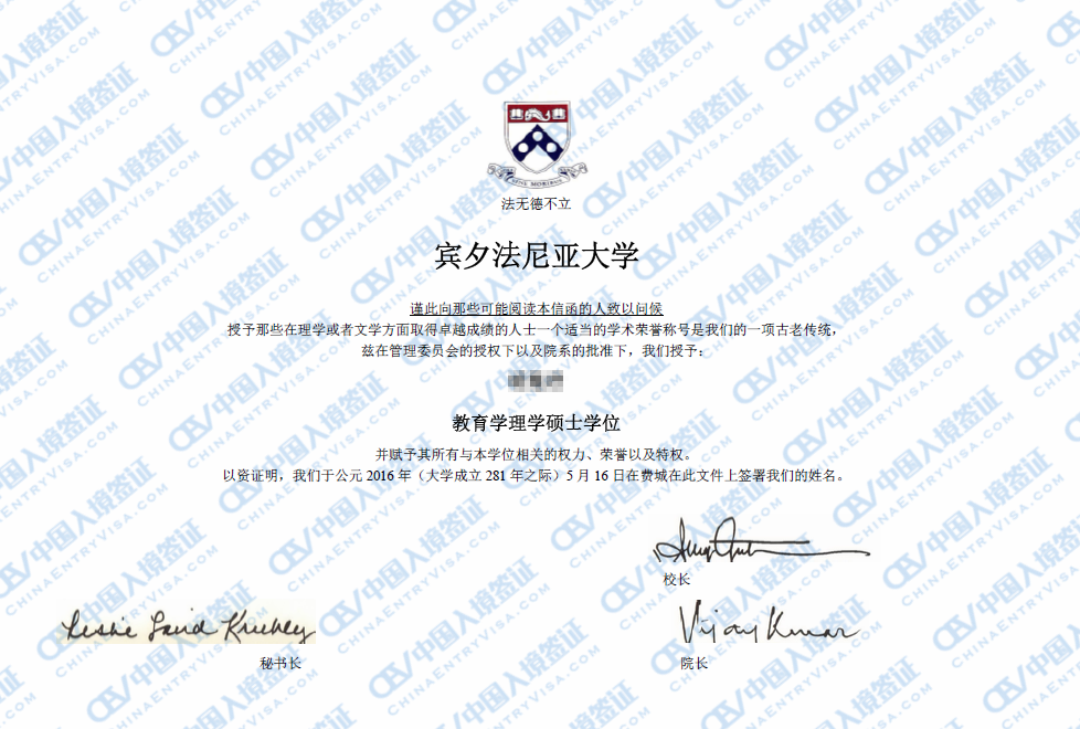 宾夕法尼亚州大学硕士学位翻译领事馆公证认证